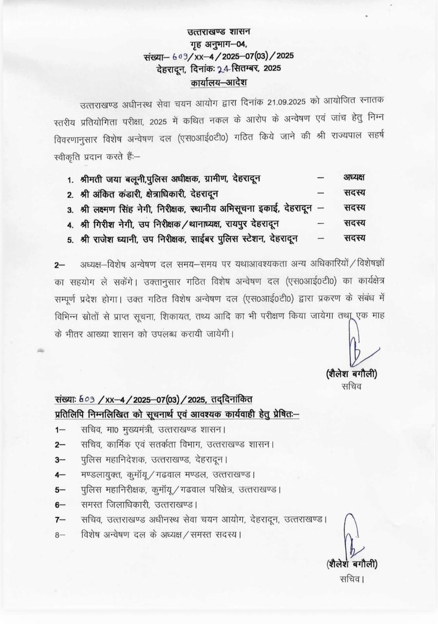 देहरादून : उत्तराखण्ड अधीनस्थ सेवा चयन आयोग द्वारा आयोजित स्नातक स्तरीय प्रतियोगिता परीक्षा, 2025 में कथित नकल के आरोपों की गंभीरता को देखते हुए राज्य सरकार द्वारा एक विशेष अन्वेषण दल (SIT) गठित किया गया है। यह दल मामले की समुचित जांच करेगा और एक माह के भीतर शासन को अपनी आख्या प्रस्तुत करेगा।