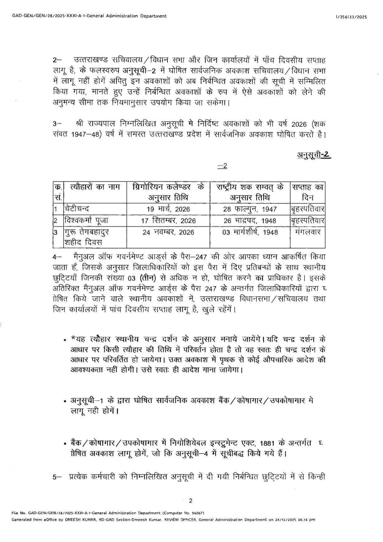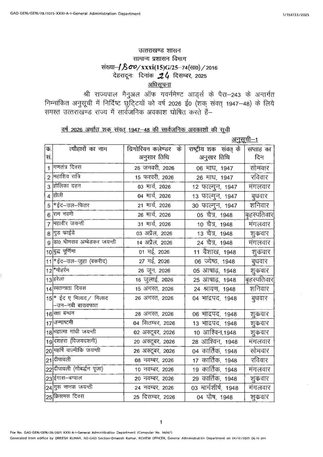 उत्तराखंड में सार्वजनिक अवकाश 2026 का कैलेंडर जारी, जानिए नए साल में कितनी छुट्टियां..